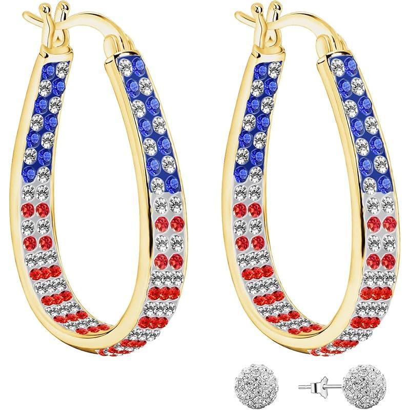 Crystal Hoop Earrings for Women Sparkly American Flag Earrings Silver Plated Red White and Blue Earrings Patriotic Jewelry Gift