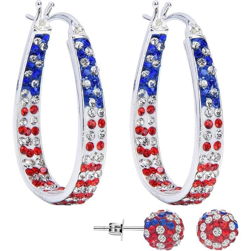 Crystal Hoop Earrings for Women Sparkly American Flag Earrings Silver Plated Red White and Blue Earrings Patriotic Jewelry Gift