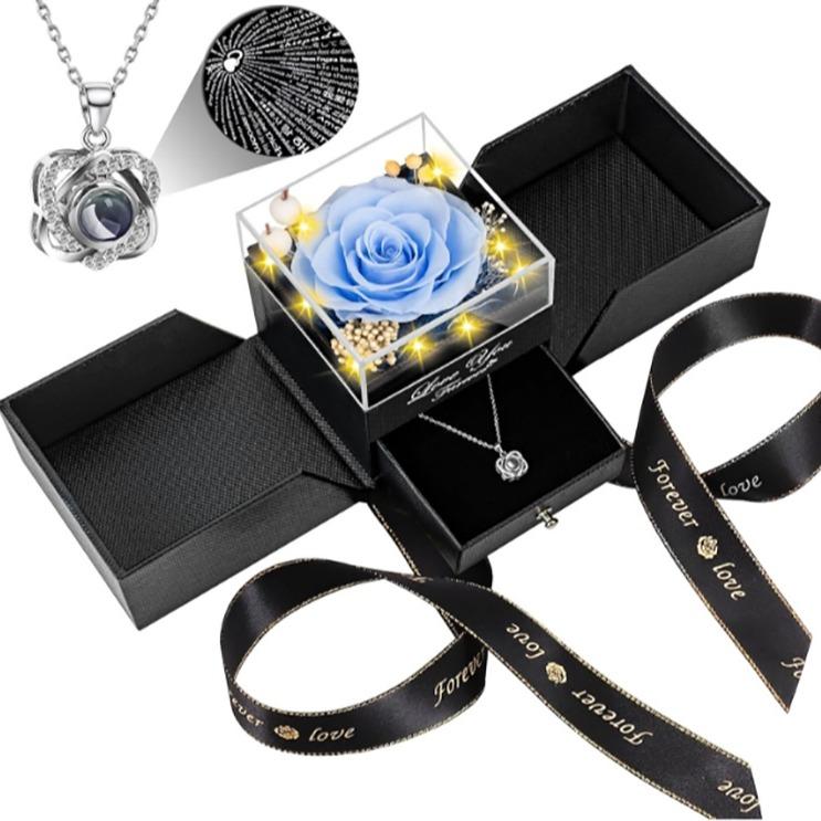 - [Im Sorry Gift for Her Packing] Mother's Day gift ideas The immortal roses are packaged in gift boxes, so you can give gifts directly without spending time on packaging. As an exquisite luxury gift, it can also store other jewels. This necklace can be worn, the rose box can be placed indoors as an ornament, and your lover will feel happy every day. 1 eternal rose+1 gift box+1 double heart-shaped necklace (with I Love You necklace in 100 languages)+1 gift bag+1 greeting card.