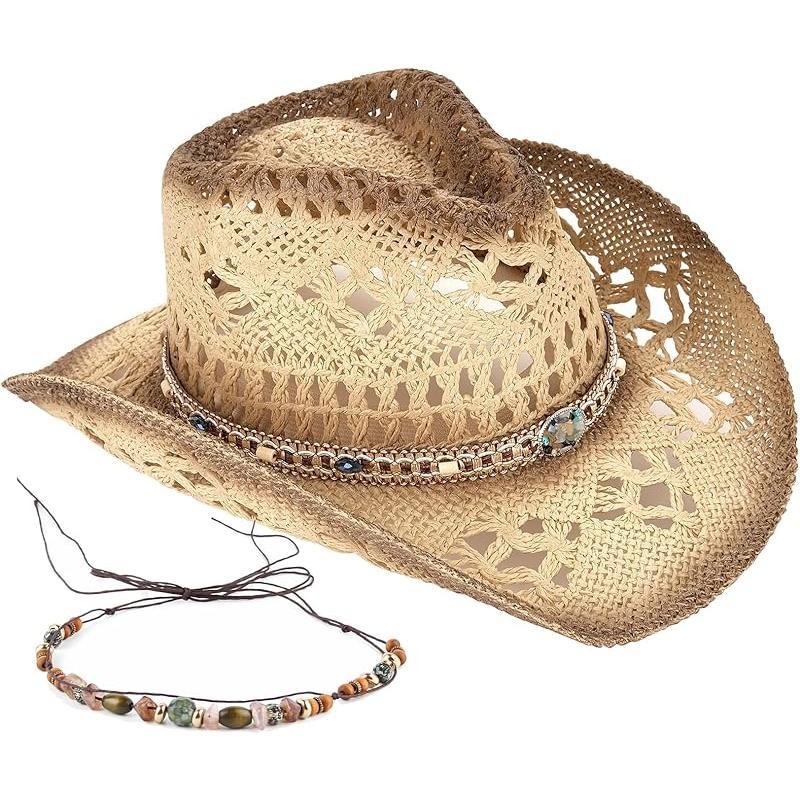 Men's Women's Straw Cowboy Hat Cowgirl Woven Sun Hat Western Cowboy Hat Two Decorative Bands