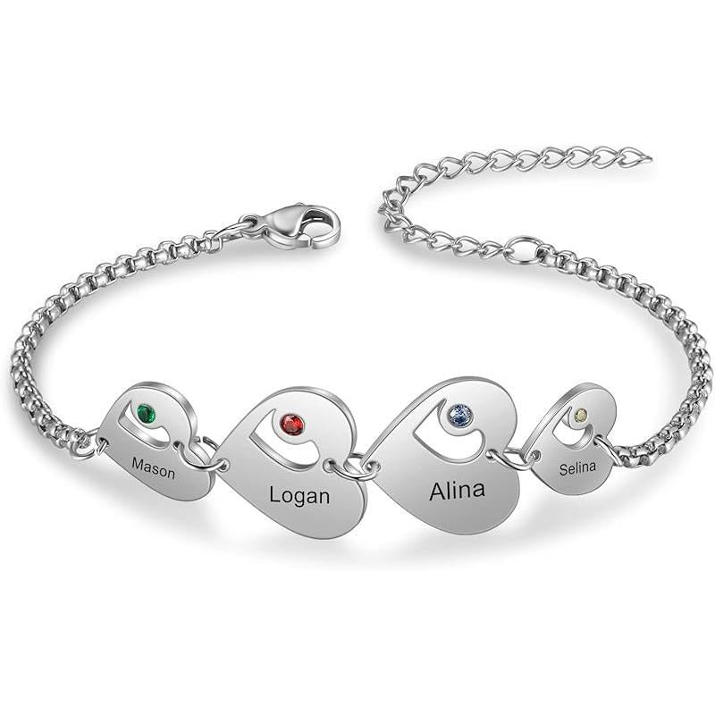Personalized Custom Name Heart Bracelet with 1-6 Birthstones Love Bracelet for Women Engraved Names Link Bracelets for Mother's Day Mom