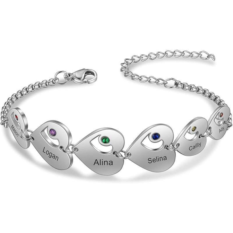 Personalized Custom Name Heart Bracelet with 1-6 Birthstones Love Bracelet for Women Engraved Names Link Bracelets for Mother's Day Mom