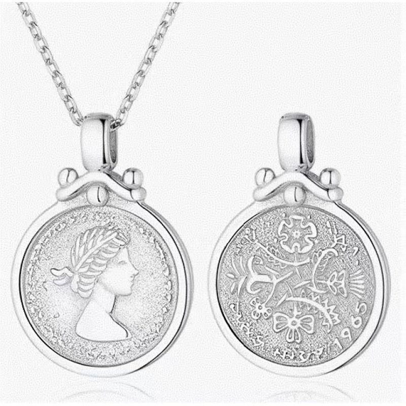 This gorgeous commemorative coin necklace combines classical and modern aesthetics and is the best choice in your wardrobe.The pendant is round, with a portrait of a woman carved on the front and exquisite floral patterns on the back.
